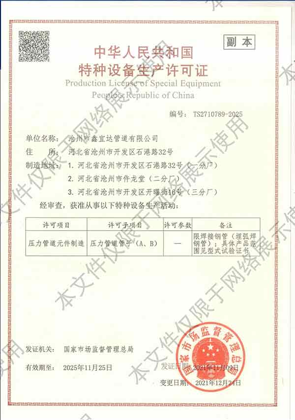 滄州市鑫宜達(dá)管道有限公司成立于2003年7月,坐落于滄州經(jīng)濟(jì)開(kāi)發(fā)區(qū),占地面積40萬(wàn)平方米,注冊(cè)資金1.81億元,是集螺旋鋼管生產(chǎn)、防腐加工以及無(wú)縫鋼管、卷板、帶鋼等品類鋼材經(jīng)營(yíng)銷售于一體的工貿(mào)型企業(yè)。公司現(xiàn)有員工400多人,其中,中高級(jí)技術(shù)職稱的人員達(dá)120余名。 滄州市鑫宜達(dá)管道有限公司擁有9條螺旋鋼管生產(chǎn)線和3PE防腐生產(chǎn)線,可生產(chǎn)直徑219--3640mm,壁厚5.5--28mm,最高鋼級(jí)X100的各種規(guī)格防腐螺旋鋼管...